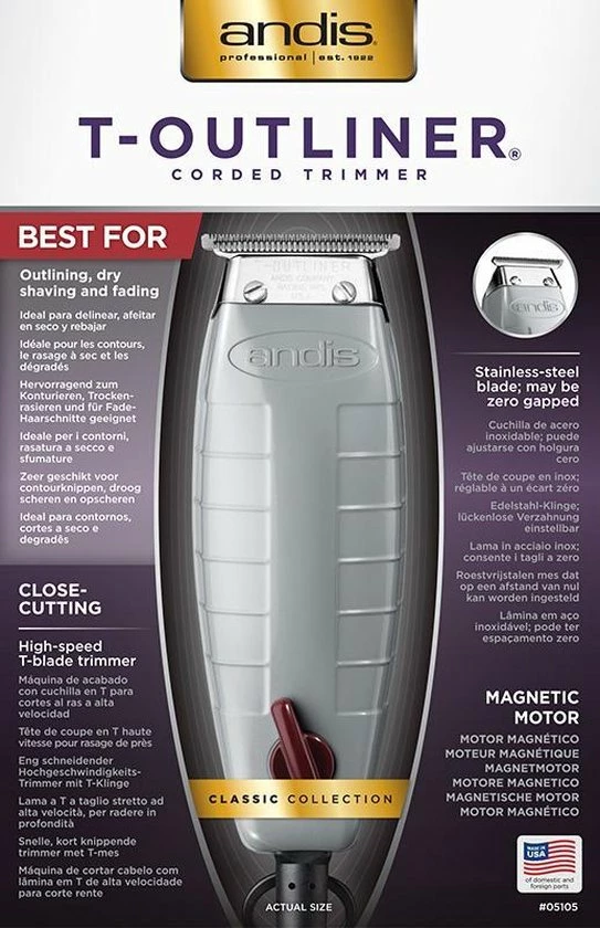 Andis T-Outliner Corded Trimmer. High speed T-Balde Trimmer. Andis T-Outliner trimmer for detailing, outlining, dry shaving, fading. You can’t work without it!