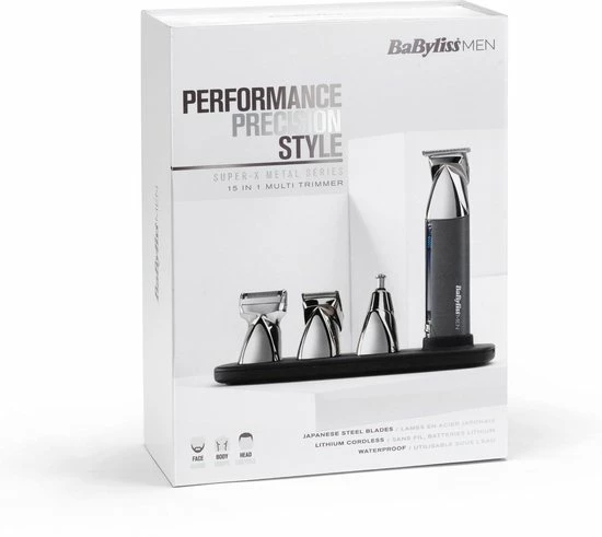 De Super-X Metal Series Multitrimmer MT996E is de nieuwste gadget van BaBylissMEN. Met deze trimmerset kun je je haar, (stoppel)baard, contouren en de rest van je lichaam scheren, trimmen en bijwerken. Je krijgt 4 verschillende magnetische scheerkoppen, die vanwege het MagFix? systeem veilig en eenvoudig te bevestigen en te verwijderen zijn. De trimmer is 100% waterproof en te gebruiken op nat of droog haar. Het is een ?chte multitrimmer, want het is een baardtrimmer, bodygroomer, precisitetrimmer en tondeuse in ??n!