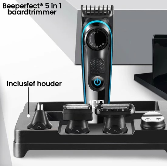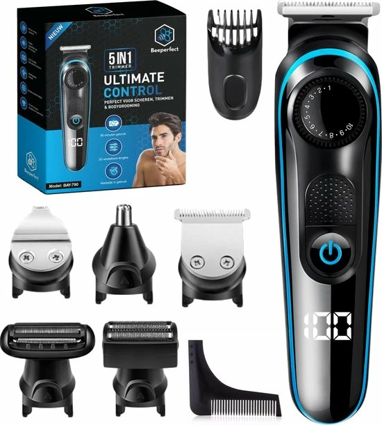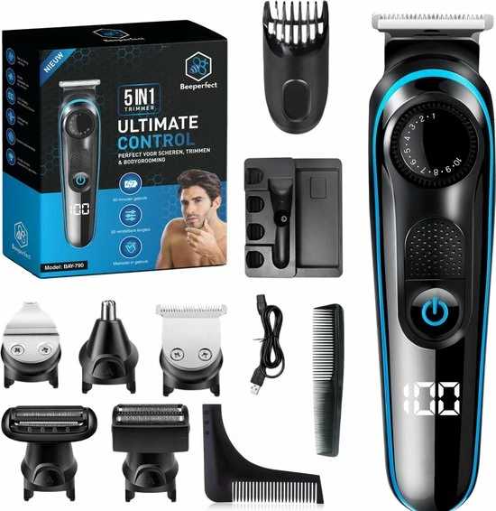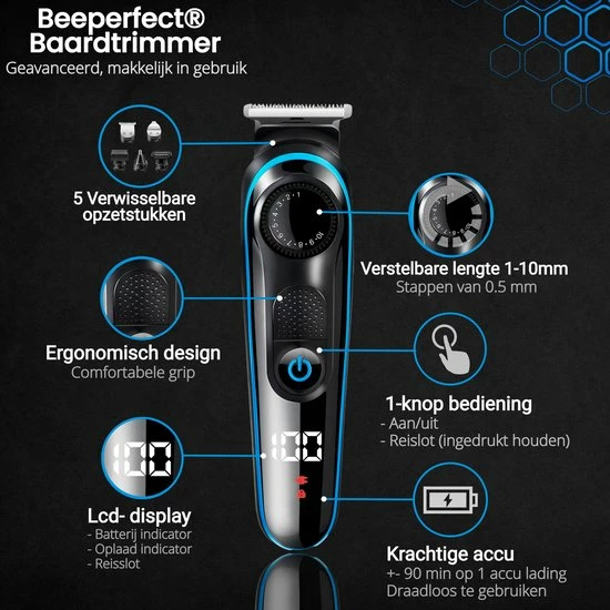 Haal met de krachtige draadloze allround baardtrimmer van Beeperfect? alles in huis om je baard en lichaamshaar volledig en comfortabel bij te werken! Met de precisiedraaiknop stel je gemakkelijk de gewenste lengte in tussen 0.1 en 10mm. Dankzij de scherpe mesjes van RVS en de krachtige accu geniet je van een comfortabele trimbeurt tot wel 90 minuten lang op ??n acculading. De set wordt geleverd inclusief 5 extra opzetstukken en een gratis baardkam voor een complete lichaamsverzorging.