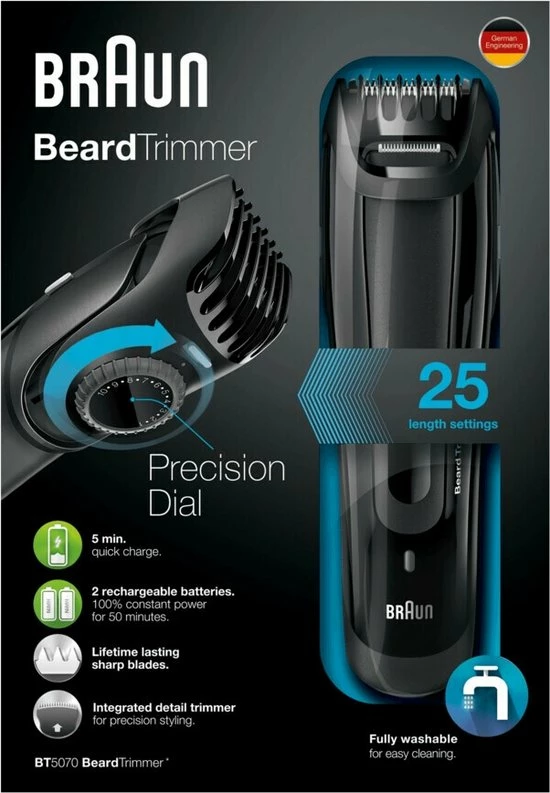 Met de Braun baardtrimmer krijg je de exacte lengte en precieze contouren ? essentieel voor iedere goede look. Of je nu een designer stoppelbaard wilt of je baard helemaal wilt trimmen, de afneembare trimkam geeft je de flexibiliteit die je nodig hebt.