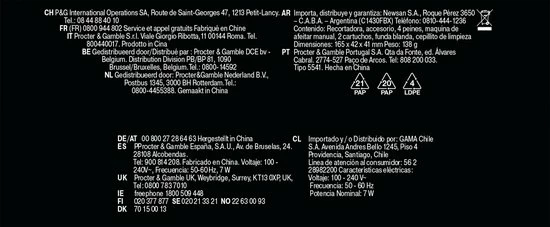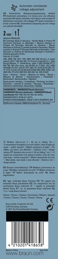 Doos bevat: 1 x Baard- en haartrimmer 1 x Precisietrimmer 4 x Kamopzetstuk 1 x Gillette scheermesje 1 x Zachte tas 1 x Reinigingsborsteltje 1 x Smart plug-lader 1 x Gebruikershandleiding
