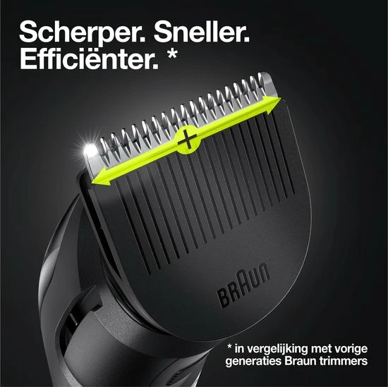 - Scherper. Sneller. Effici?nter: De trimmerkop heeft een bredere scheerzone en scheert meer haartjes bij elke beweging (in vergelijking met vorige Braun trimmers). Krijg je look in minder bewegingen
