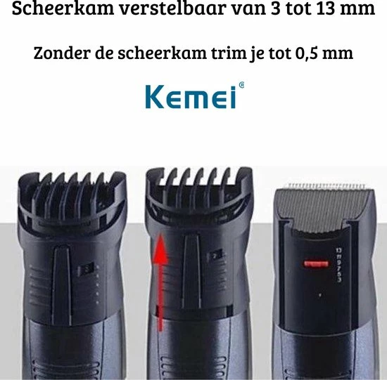 – Verstelbare opzetkam om te trimmen van 3-13 mm. Ook te gebruiken zonder kam om tot 0,5 mm te kunnen trimmen.