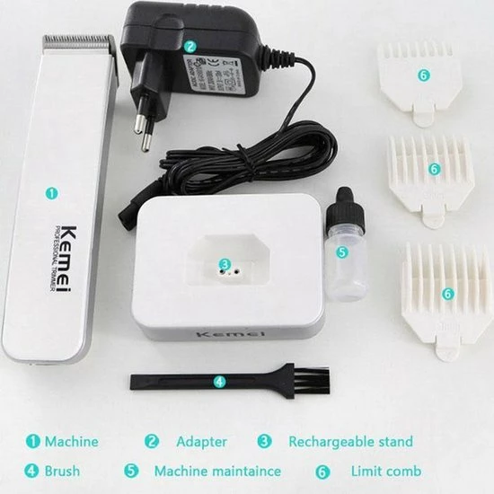 Styleer en trim je haar en baard met de Kemei PROFESSIONAL baard en haartrimmer. Houd je look tip-top dankzij deze professionele haar en baard trimmer. Dankzij de 4 meegeleverde opzetstukken kan je je haar en baard gemakkelijk trimmen tot verschillende lengtes. Deze meegeleverde opzetstukken hebben de volgende lengtes (3-6-9). De Kemei PROFESSIONAL haar en baardtrimmer is oplaadbaar en bruikbaar met en zonder snoer. Zonder snoer heeft de baardtrimmer 45 minuten gebruikstijd. Deze premium tondeuse wordt geleverd met een oplaadstation. De oplaadtijd van deze premium trimmer is 8 uur. Er wordt ook olie meegeleverd om de premium scheermessen te smeren en scherp te houden. Bijkomstig wordt er ook een borstel meegeleverd om de scheermessen te reinigen na gebruik.