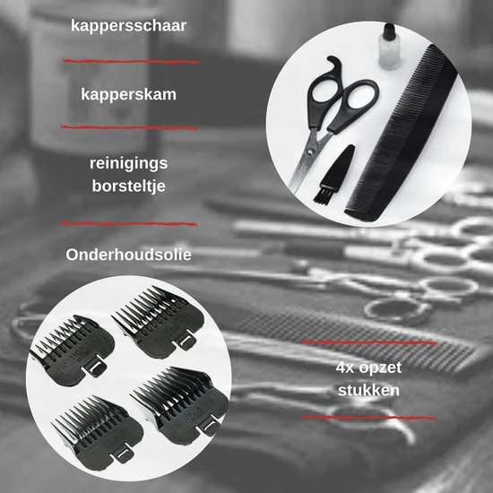 4 limietkammen (3 mm, 6 mm, 9 mm, 12 mm), hiermee kun je de lengte van je haar vrij regelen.