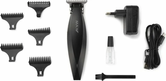De trimmer wordt geleverd als set met 5 opzetkammen (1mm, 2mm, 3,5mm, 5mm, contour/shading kammetje), een reinigingsborsteltje en olie. De vloeibare reinigingsolie is een speciaal ontwikkelde olie voor de snijbladen van de tondeuse zodat er geen haren blijven plakken tussen de snijbladen waardoor de weerstand en volume worden verlaagd ?n de levensduur van de tondeuse wordt verlengd. Met de meegeleverde hulpstukken heb je alles in huis om niet alleen een mooie strakke baard te cre?ren, maar ook je contourlijn bij te houden, een shading effect te realiseren of strakke lijnen en figuurtjes te maken op de hoofdhuid. Ideaal dus tussen de knipbeurten door!