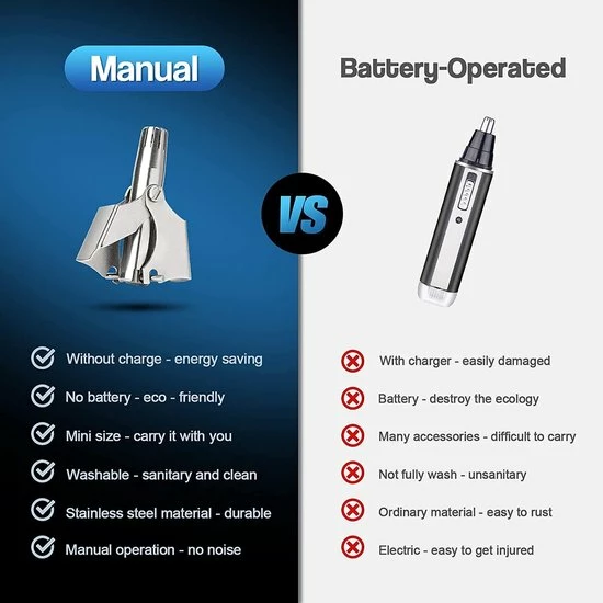- Deze nose trimmer heeft geen batterijen of elektriciteit nodig, waardoor je het overal makkelijk kunt gebruiken.