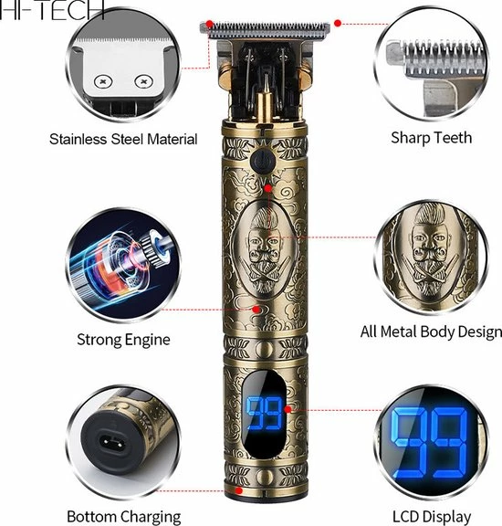 Deze luxe baardtrimmer of tondeuse kan gebruikt worden om uw baard te trimmen of het hoofdhaar te scheren. Twee in een dus! De trimmer ligt fijn in de hand en ziet er daarnaast nog eens stijlvol uit dankzij de gouden kleur en graveringen. De keramische kop bevat scherpe mesjes waardoor jij in een handomdraai je baard of hoofdhaar kan trimmen. De tondeuse word meegeleverd met 3 verschillende opzetkammetjes van 1mm, 2mm, 3mm, zo heb je zelf in de hand hoe lang de haren moet blijven. U kunt door de meegeleverde opzetstukken op 4 verschillende standen scheren. Aangenaam, effici?nt en snel scheren is wat je kan verwachten van de baardtrimmer.