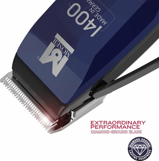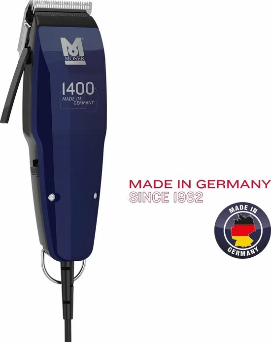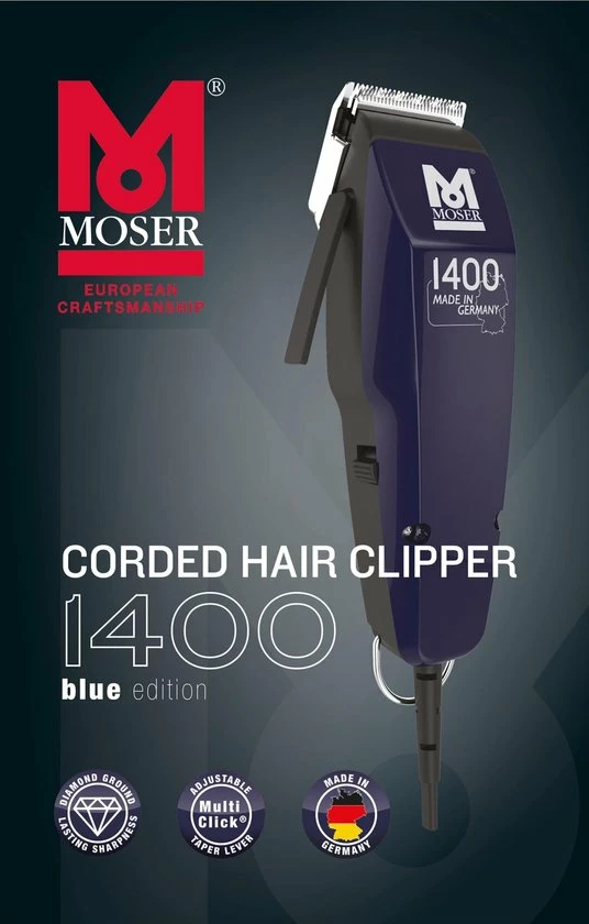 Moser 1400 Blue edition. Kleur van het product: Zwart, Blauw, Minimale haarlengte: 0,7 mm, Maximale haarlengte: 1,8 cm. Stroombron: AC, Vermogen: 10 W, AC invoer voltage: 220 – 240 V. Verbinding kammen: Hoofd. Land van herkomst: Duitsland