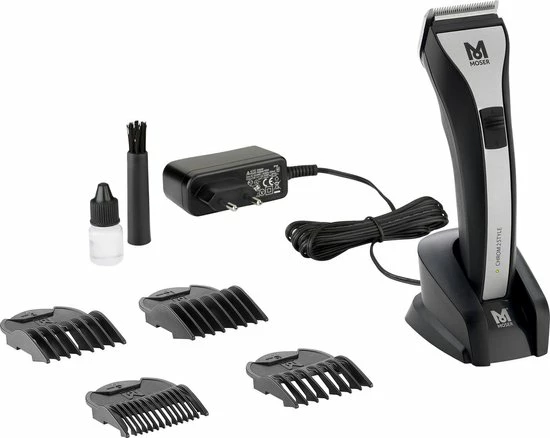 Bij deze Moser Chrom2Style Tondeuse worden 6 zwarte opzetkammen ( 1.5 / 3 / 4.5 / 6 / 9 / 12mm), oplader, oplaadstation, reinigingsborsteltje en olie geleverd.