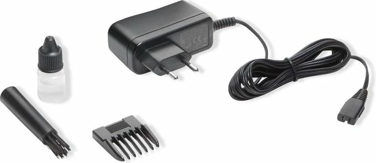Bij deze Moser NeoLiner Trimmer Zwart wordt 1 vario opzetkam ( 3, 6mm), adapter, reinigingsborsteltje, olie en etui geleverd.