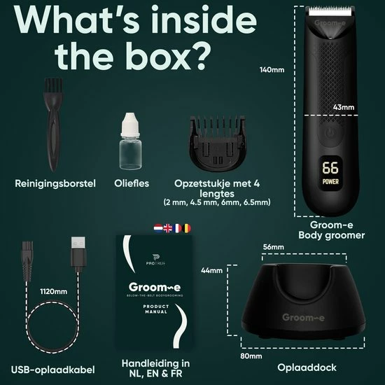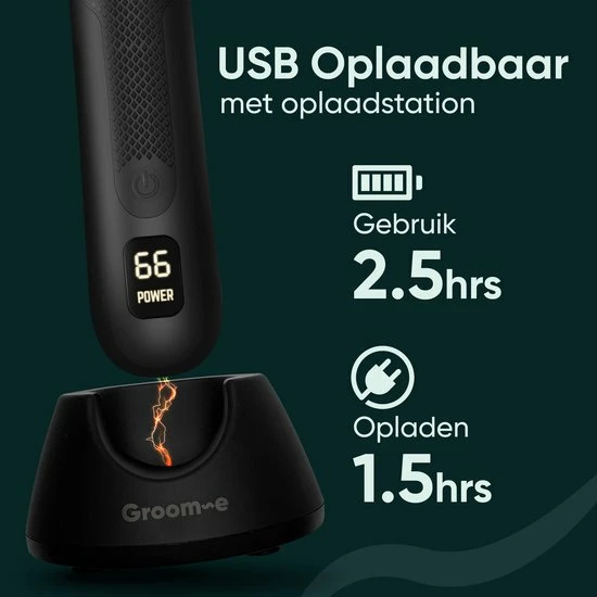 ? WATERDICHT EN DRAADLOOS: De Groome Body Hair Trimmer is duurzaam en waterbestendig, perfect voor het scheren onder de douche. Na gebruik plaats je de manscaper makkelijk in het meegeleverde oplaadstation voor een volle batterij de volgende keer.