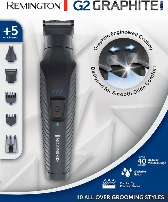 Altijd volledig verzorgd met de G2 multigroomer uit de Graphite Series. Hoofd, gezicht of lichaam, met 5 opzetstukken hoef jij nooit meer te wisselen van stylingtool om je stijl te veranderen. De grafieten snijbladen zorgen ervoor dat de groomer moeiteloos over de huid glijdt. Met de G2 ben je écht volledig verzorgd.