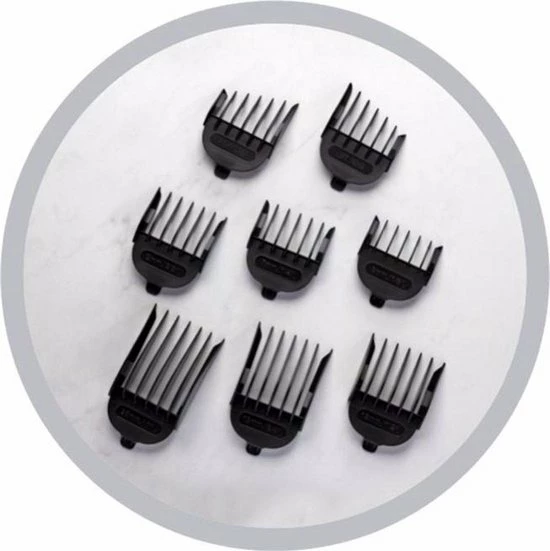 Met 8 opzetkammen om uit te kiezen, kun je verschillende haarlengtes van 3-25 mm creëren. Met de conische hendel pas gemakkelijk de lengte-instelling aan naar wens.