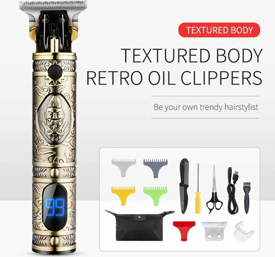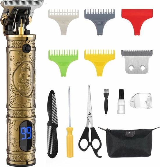 Deze luxe baardtrimmer of tondeuse kan gebruikt worden om uw baard te trimmen of het hoofdhaar te scheren. Twee in een dus! De trimmer ligt fijn in de hand en ziet er daarnaast nog eens stijlvol uit dankzij de gouden kleur en graveringen. De keramische kop bevat scherpe mesjes waardoor jij in een handomdraai je baard of hoofdhaar kan trimmen. De tondeuse word meegeleverd met 3 verschillende opzetkammetjes van 1mm, 2mm, 3mm, zo heb je zelf in de hand hoe lang de haren moet blijven. U kunt door de meegeleverde opzetstukken op 4 verschillende standen scheren. Aangenaam, effici?nt en snel scheren is wat je kan verwachten van de baardtrimmer.