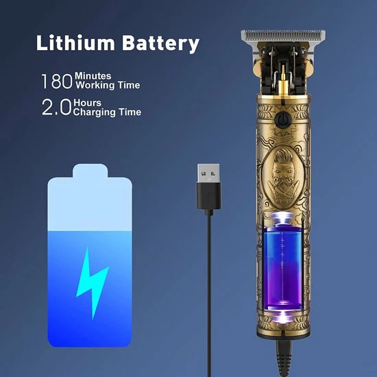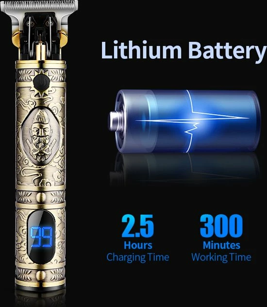De tondeuse is draadloos te gebruiken en heeft een batterijduur van 180 minuten. Op de display kunt u aflezen hoeveel procent de professionele trimmer nog vol zit, zodat u nooit onverwachts een lege batterij hebt. Binnen 2 uur is de tondeuse weer volledig 100% opgeladen.