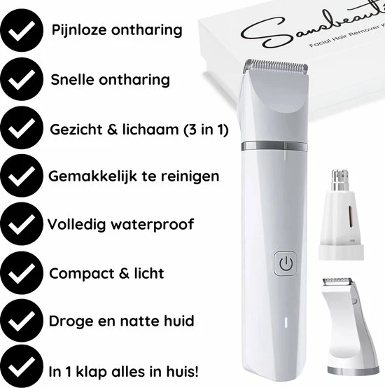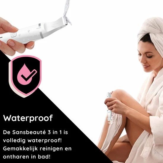 Klaar met ongewenst haar op je gezicht (bovenlip, kin, wangen, kaaklijn) en lichaam (benen, armen, handen, oksels, bikinilijn / bikinitrimmer)? En je bent die pijnlijke scheerapparaten zat? Sansbeauté® 3-in-1 Bikini Edition is dé perfecte oplossing! Met 3 verschillende scheerkoppen scheer jij elk haartje op je gezicht en je lichaam pijnloos weg! Daarnaast heb je met de 3 opzetstukken in één klap alles in huis, dus ook financieel aantrekkelijk! Door de verwerking van LED-icoontjes kun je nu gemakkelijk aflezen wanneer je moet opladen! Ook is het draadloze apparaat volledig waterproof waardoor een fijne behandeling onder de douche of een snelle reiniging onder de kraan een feit is! Al met al, een perfecte set voor jou en ONMISBAAR in noodsituaties!