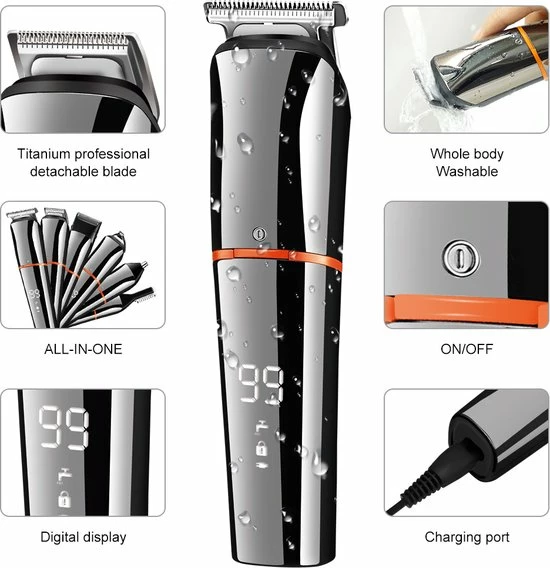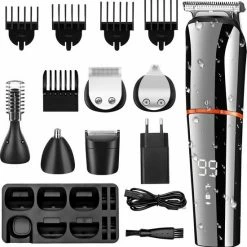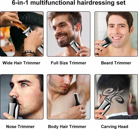 6 DIVERSE ACCESSOIRES: Krijg je beste schoonheidsstijl en authentieke look. Trimmers in alle maten voor kapsels. Micro scheerapparaat voor het trimmen van details. Precisietrimmers voor een gladde snede. Neustrimmer voor neus en oren. Body clipper voor comfortabel knippen. Design tondeuse voor trendy kapsel.