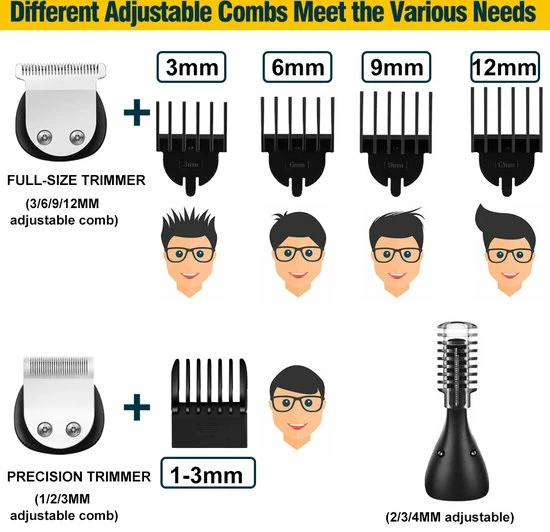 Een verstelbare tondeerschoen voor baarden (1/2 / 3mm), een verstelbare schoen voor lichaamshaar (2/3 / 4mm), 4 tondeerschoenen voor haar (3/6/9 / 12mm).