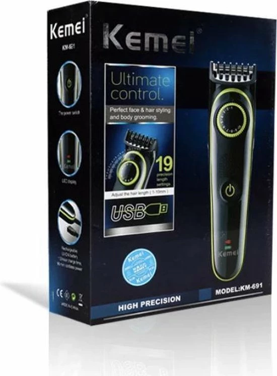 Styleer en trim met de Kemei 619 haar en baardtrimmer. Houd je look tip-top dankzij deze professionele haar en baard trimmer. Deze trimmer heeft een standaard verstelbare lengte van 0.8mm tot 2mm. Maar met de meegeleverde opzetstuk kan je je haar en baard gemakkelijk trimmen tot verschillende lengtes. Deze meegeleverde opzetstuk heeft lengtes van 1mm tot 10mm . De Kemei 619 premium haar en baardtrimmer is oplaadbaar en bruikbaar met en zonder snoer. Zonder snoer heeft de baardtrimmer 90 minuten gebruikstijd.