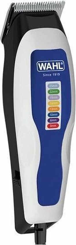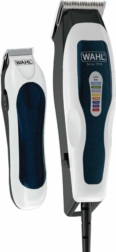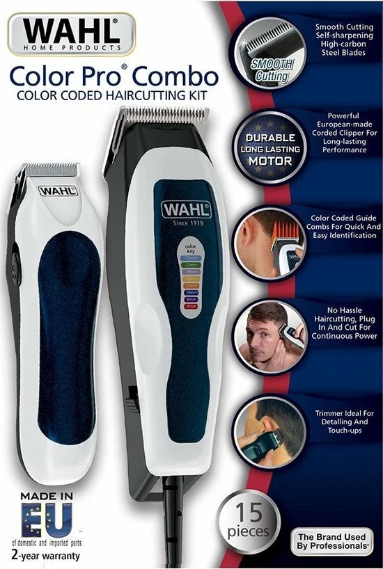 De Color Pro Combo-tondeuse en trimmer van Wahl zijn een combinatieset die bestaat uit een tondeuse en een batterij-aangedreven mini-trimmer (1 x AA-batterij vereist, niet inbegrepen). De compacte mini-trimmer is ideaal voor details en touch-ups! Beide apparaten hebben krachtige en duurzame trillingsmotoren die geschikt zijn voor langdurig gebruik. Deze tondeuse levert een professionele snijprestatie met gelijkmatige resultaten dankzij de precisie-, zelfslijpende, koolstofstalen mesjes die langer scherp blijven dan andere mesjes die verkrijgbaar zijn op de huidige markt. Levering bevat 8 kleurgecodeerde geleiderkammen (3 mm, 6 mm, 10 mm, 13 mm, 16 mm, 19 mm, 22 mm, 25 mm), een opberghoes, instructies en accessoires.